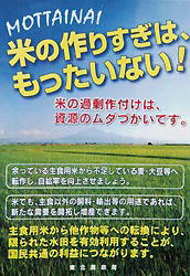 こんなポスター作って目先の減反目標自分らの業務目標が達成しない言い訳や言い逃れを考えるより、5年、10年、20年先の中長期的な食糧生産計画、農業政策に真剣に取り組んで貰いたいモノである。近い将来「にっちもさっちも」行かなくなってから「どうしよう?」慌てても知らんよ。