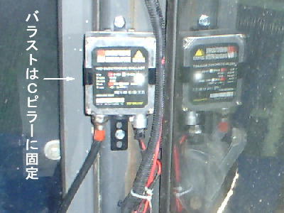 | 手始めに灯体に奥行きの余裕のある為に一番付け替えがラクそうなフェンダー上の作業灯パトロールからHIDにコンバート。無加工で問題なくそのまま換装完了。 | バラストはCピラーに取り付け固定。電源はリレーハーネスが以前から引いてあるので、そちらへ接続。 H1のバーナーの色温度は4300K |