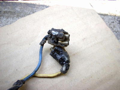 | 購入後20年以上のRECTA H4 リフレクターにサビは出ていないもののレンズはかなり汚い・・・ | フタを開ければ・・・「ゲッ!」バルブの端子のゴムのカバーが溶けてる・・・。恐るべし経年劣化。ほとんどってか全くタール状。 |