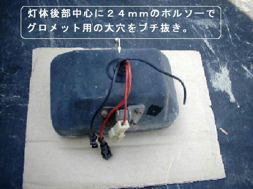 そのまま灯体の中に収まらないなら、バーナー後部が干渉するので何の未練もなく灯体の後部中心部に24mmのホルソーで大穴をブチ抜いてグロメットを通す。沃素球も付いているのでコードは4本。