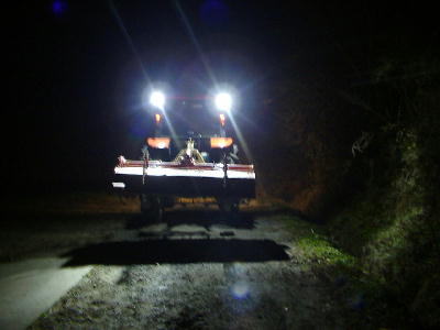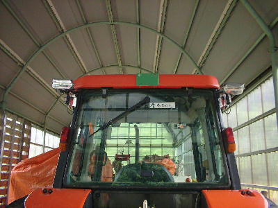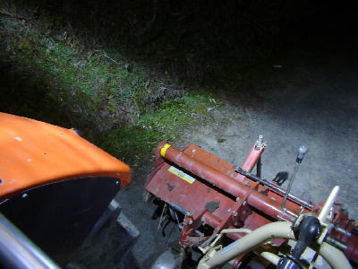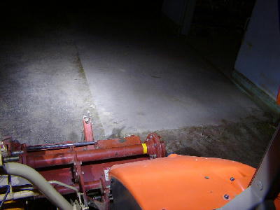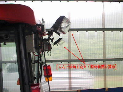 作業中の照射範囲。写真で見える範囲で、片側5条刈りコンバインの5行程=7.5mは光が届いているのが解る。(携帯電話のカメラで撮影したために画像がキタないのはご容赦を。) |