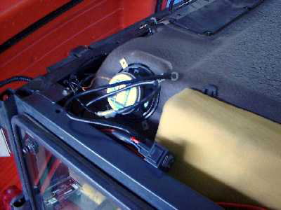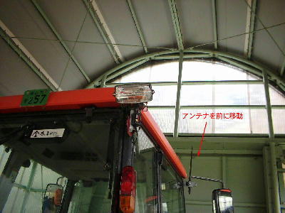 | ルーフをめくったついでに高電圧でラジオノイズが入るのを防ぐのにアンテナを前に移設 | 左右の照射範囲は1個で充分すぎるほど広いので左右の灯体の俯角を変えて照射範囲を前後に伸ばす。 |
