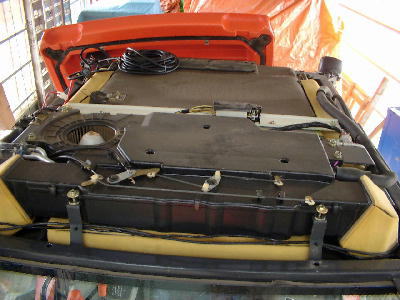 | 後の作業灯を左右両方HID化する為に純正作業灯のハーネスのグロメット穴からバッテリー直引きリレーを介して電源を確保すべく、ルーフを取り外して配線。ルーフの中とご対面。天井裏はこんな具合。外したついでにラジオのアンテナ線も引き直して、後から前へ位置変更。 | |
