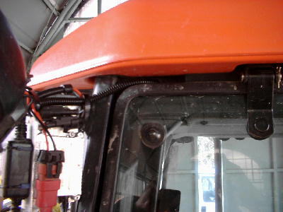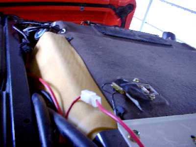 | ルーフを外して、Bピラーから5sqのコードを降ろして本機の電源取り出しカプラーと接続。とてもバッテリーまでは届かない。 | キャビン後方の天井裏。固定しようが無いのでウレタンの緩衝材のある所にリレーを放置?? |