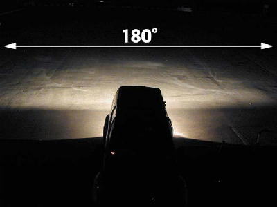 | 実物を見てみると照射範囲180度のワケはこんな形状の樹脂レンズ。泥で汚れているときにヘタにブラシでこすると傷だらけになりそう。 | 照射パターンはこんな具合。左右の照射範囲は優に20mはある。足下を照らすのに俯角が大きいのでどうしても照射範囲は狭くなるのが難点。 |