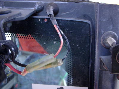 | 上のグロメット穴からリレーハーネスの線を引き出し。裸ではキャビンと接触して怖いのでコルゲートチューブで保護。 | 引き出した電源ハーネスをイグナイター、バラストのカプラーと接続。黒い「オスカプラー」付きなのでグロメット穴から引き出す際は黒いオスカプラーからコネクターを外して引き出し。 |