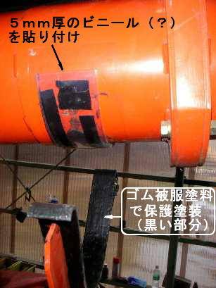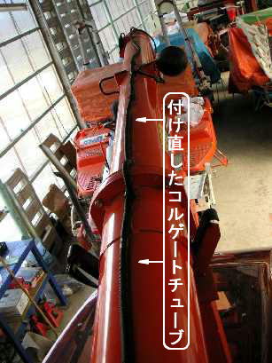 | 劣化でボロボロなので張り直してみると結構な長さのオーガ上のコルゲートチューブ。作業灯カプラも劣化で端子ムキ出し。 | オーガ受け部。常に擦れ合う所。ゴム塗料を塗って、その辺に転がっていた厚手のビニール板を貼り付け。 |