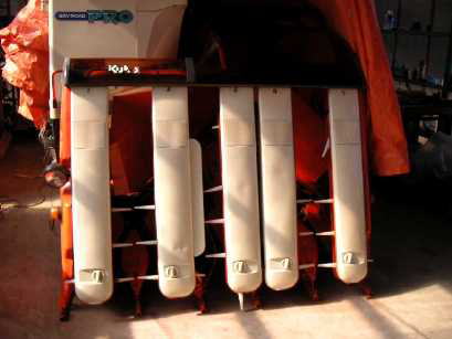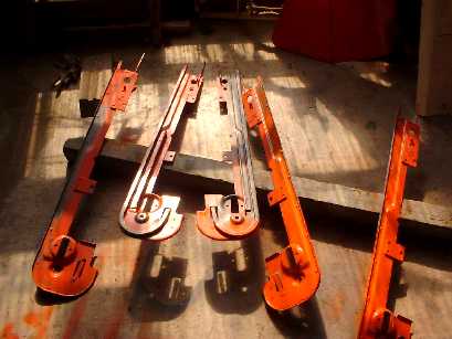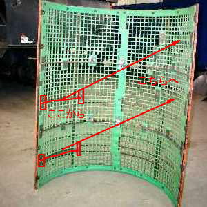 | こぎあみ全貌。弓形の金具を付け替えて前後逆に組み付ける。弓型金具が車体外側(フィードチェーン側)になる。 | 本来、写真の横桟と同じ厚みのハズが摩耗して約半分の厚みになっている。見てしまうと使い続けるのはちょっとコワい。 |