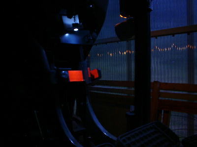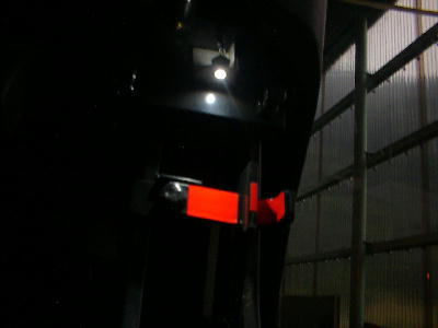 | ブレーキペダルの所に足下照明。ライトONで常時点灯にしてある。あんまり明るくても目障りだし電気喰うのでエーモンの5mmの小さなLEDをアルミ板をL字に曲げたステーに付けて両面テープで貼り付けてあるだけ。 また「連結」−「非連結」が一目で分かるように「反射蛍光」のテープを連結金具に貼り付け。「赤いのが横一文字」で連結。この程度だと作業中でも光は全く気にならない。これはGM。 |