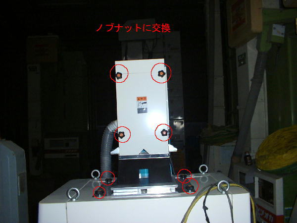 玄米選別機の上部のボルトを手で外せる様にノブナットに交換。掃除の際に頻繁に付け外しするので手で外せることで、作業性は格段に向上した。