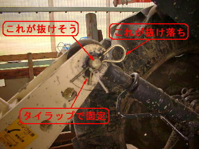| 作業機クイックヒッチのトップリンク。Rピンで留めてあるだけなのでRピンが抜けるとトップリンクのピンも抜けるのでタイラップで固定 | こちらは本機のリフトロッド。滅多に抜けることはないが、転ばぬ先の杖ってコトでステンレスの針金を巻き付け捩って固定。 |