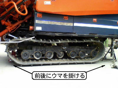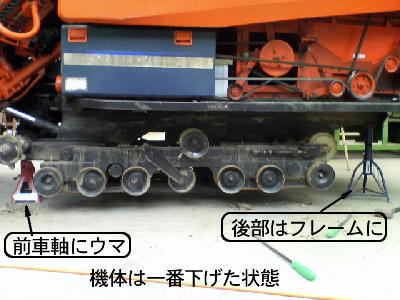 8、上げたクローラを下げて(機体上昇位置に戻す)ウマを外す。 道具を片付けて終わり。