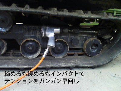 7、インパクトレンチでガンガン早回しでクローラを適正位置まで張るり、ロックナットで固定