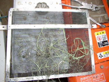 こんな状態で稲の葉を吸い込んでしまう。写真右下に見える黒い太い筒状のはステアリングシャフト。ダストスクリーンは装着済み。 約3ヘクタールの散布でこれだけのゴミを吸い込む。(2003年撮影)