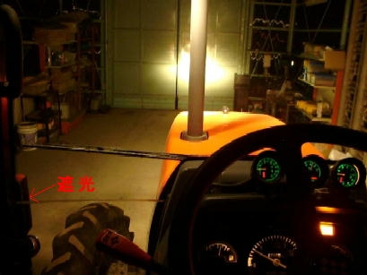 ヘッドライトとウィングライトを点灯の図。エンジンフードに反射光がないので格段に見易い。少々はグレアが出そうだが上に光源があるよりは大分マシになった。それでもまだ光源が見えるため目障り。何らかの遮光を考えた方が確実に見易い。問題は代掻き時の泥はね。見ての通り光軸は、かなり下げてあるので対向車を幻惑することはまずない。要するに自動車の夜間走行の視界に近い状態。大多数の人にとってこの方が絶対自然なハズ。