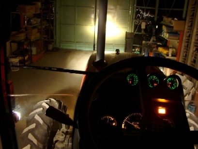 上の左の写真のヘッドランプのみの場合は、足許が見えないので作業時に決して見易い配光ではない。右写真のルーフの作業灯点灯時が通常の夜間作業の状態。足許が見える分は幾分見易い。しかしエンジンフードからの反射光が目障り。