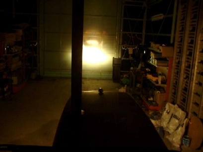 | いつぞや処分価格で買ってきてあったPIAAの補助灯。配光はピンスポットでイマイチ気に入らんがコンパクトさに惹かれて買った一品をウインカーの下に仕込んでみた。右が点当時。スポットと言うモノの必要充分の照射幅はある。 | |