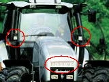 図中○印内、ヨーロッパ製トラクターに必ず付いている。左から、フェント700、ニューホランドTM(旧フォード)、ファーガソン4270、ランボルギーニビクター。当然ヘッドライトとルーフにも作業灯が2−4灯装備。ランボルギーニビクターに至ってはヘッドライトの上に5灯も補助灯を装備しているのd、計11灯!。一体オルタネータの容量(発電量)は如何ほど?ちなみにフェント900系のオルタネータの容量は、14V、144Aつまり2kwもある。言い換えれば2.6馬力のモーター。ほとんど無敵やな