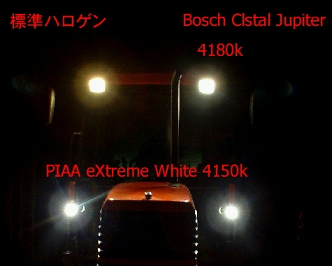 変わりに登場したのが、HIDを代表とする青白い「色温度の高い」バルブ。普通の沃素球で色温度は3600k前後とされています。前項で紹介した画像は、標準ハロゲン球なので、3600k前後。それにしては黄色っぽいので3200−3400k相当ではなかろうかろと。追加したウィングライトのpiaaのが「extreme white」なので4150k。