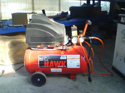 寒風に晒されないし、ホコリを被らないし電気が引いてあるので「よなべ」も出来て上の写真の如く冬場の機械の整備にも使ってるスペースな訳だが、爪の交換などエアツールを使いたいときはチト不便ってなコトで、それならいっそのこと、「ちっちゃいコンプレッサーを買っちまえ!」とホームセンターでこんなのを購入。