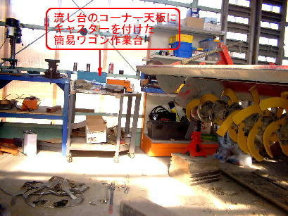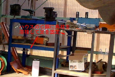 | 廃物利用の作業台。古い流し台のコーナーの天板に足とキャスターを付けて簡易作業ワゴン。天板が広いし移動可能なので思った以上に具合がよろしい。 | いかんせん軽いのでバイスで大物を扱うと動いてしまうのでハウスのC鋼に角柱を溶接して、そこへ作業台の足を固定。移動や分解などは眼中にない!!(当時) |