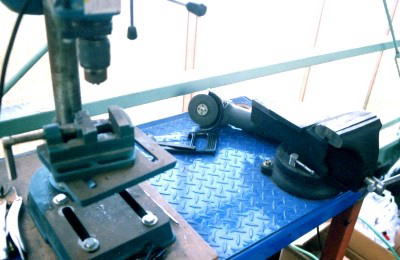 そこであれこれモノをいじったり加工するときに欲しいのが作業台。コンクリートの地べたでするのも都合悪いし・・で、手持ちの廃物(モノ)を流用して使って作った作業台。卓上ボール盤で穴を開けたりバイスに挟んで加工したりするのに据えたのがこれ。