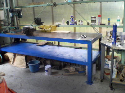 | 超デカくて超重いリッパな「ド鉄の塊」作業台。外すのがメンドーってコトでJIS規格品の超重いバイスとグラインダー付き。幅約230cm、推定重量200kg以上。一人で手で動かすコトは不可能。据えるのに当然フォークリフトで動かして50mm角の角柱でコジって据えた。図右は錆や汚れを落として手持ちのペンキで化粧直し。 | |