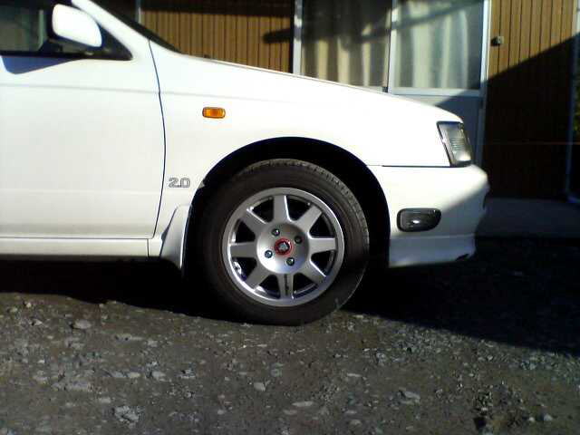 純正のオプションMAXサイズがプリメーラと共通の195−60−15。おそらく乗り心地なんかを考えるとこのシャシにはベストマッチかと。(純正のホイル幅は6JJだけど)タイヤ幅を広くするとカッコ良くは見えるだろうが、そんな歳でもないしぃ、バネ下重くなるしぃ、走行抵抗が増えるので却下。